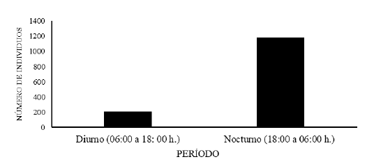 El cálculo de la diversidad fue de H’= 2,66 (J’=0,81 Taxa= 27) para el período de diurno de 6:00 -18:00 h. y de H’= 2,61 (J’=0,66 Taxa= 51) para el período nocturno de 18:00-6:00 h. No se encontraron diferencias significativas en la diversidad para los distintos periodos de muestreo (p=0,928; t de Hutcheson).
