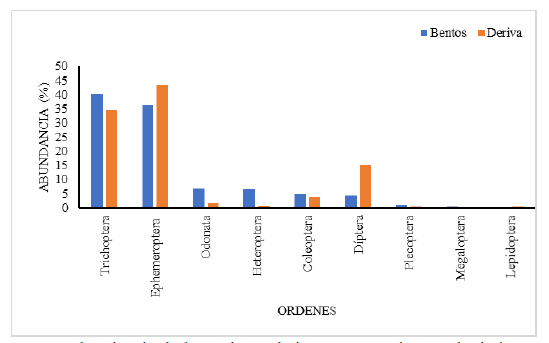 De forma general, la entomofauna acuática en la deriva estuvo agrupada en 9 órdenes; 30 familias, 43 géneros determinados y 10 géneros sin determinar. En términos de abundancia, los órdenes se distribuyeron de la siguiente manera: Ephemeroptera con 602 individuos, lo que representa el (43,4 %), Trichoptera con 478 (34,46 %), Diptera con 209