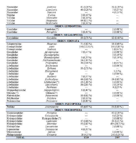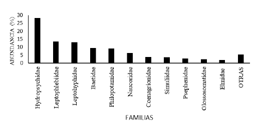 Corydalidae, Hydrophilidae, Scirtidae, Oligoneuriidae, Calopterygidae, Gomphidae, Glossosomatidae, Lampyridae, Psephenidae, Empididae, Caenidae, Leptoceridae y Odontoceridae familias que representaron el 3,24 % (Fig. 7, como otras).