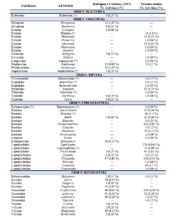 En el Cuadro 1, se presentan los resultados de los órdenes, familias y géneros de insectos acuáticos, en la comunidad bentónica, reportados en Cárdenas, (2017). Se encontraron diferencias significativas en la abundancia de los insectos acuáticos entre el presente estudio y el de Rodríguez & Cárdenas, (2017), (Friedman, Q= 9,87, gl= 2, p= 0.007),