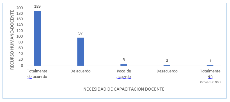 El recurso humano-docente respondió fuerte y claro, ya que siente la necesidad de capacitarse como actividad académica y profesional; por lo que 189 (64.06%) señalo estar totalmente de acuerdo con realizar jornadas de perfeccionamiento, y si agregamos que 97 (32.88%) lo reforzo a través de estar de acuerdo con esta actividad.