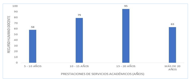 Los resultados obtenidos mediante la aplicación del formulario en línea, posibilitan el análisis de los datos recopilados; por consiguiente, se incluye en la Figura 1, la categorización del rango de años de acuerdo a la hoja de prestaciones de servicios académicos de los profesores encuestados, destacándose como uno de los aspectos fundamentales en el estudio.