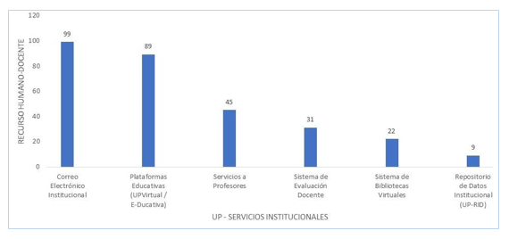 Por otro lado, en la figura 3 se presentan los resultados obtenidos de la frecuencia y uso de los servicios institucionales que brinda la Universidad de Panamá, a todo el claustro del recurso humano-docente, como soporte a las actividades educativas a nivel superior. Cabe señalar entonces que, en los primeros lugares están el correo electrónico institucional 99 (33.55%), y luego le sigue las plataformas educativas 88 (29.83%); lo que denota una relación directa entre estos servicios, ya que, a través del correo se realiza el proceso de inscripción del estudiante en el aula y también lo concerniente al registro de actividades educativas (Foros, Laboratorios, Parciales, entre otros) y el control de la evaluación general en las asignaturas de cada docente.