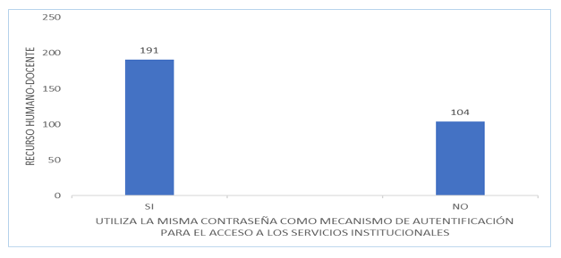 También se puede indicar que, sólo 69 (23.38%) del recurso humano-docente, diseña y estructura su mecanismo de autentificación cumpliendo parámetros técnicos más adecuados en materia de seguridad; lo que marca un precedente para proponer jornadas de capacitación académica en este aspecto.
