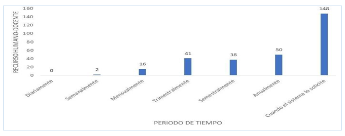 Como una cadena de eventos que inciden de forma directa en las diversas circunstancias en una situación particular, se suma a lo antes expuesto, el análisis de los periodos de tiempo que aplica el recurso humano-docente para hacer cambios o ajustes en los mecanismos de autentificación, lo cual se presenta la figura 6.