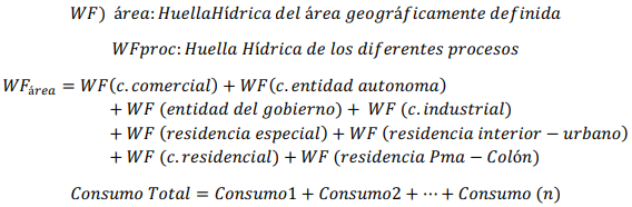 El estudio de la huella hídrica “dentro de un área geográfica se define como el consumo y la contaminación total del agua dulce dentro de los límites de dicha área” (FUNDACIÓN MAPFRE, 2011, p.66). Esta metodología presenta la siguiente ecuación para la cuantificación de la huella en áreas geográficamente definidas, donde se incorporan los procesos y sectores en el corregimiento de Chilibre. La huella hídrica define de la siguiente manera (fórmula 1):