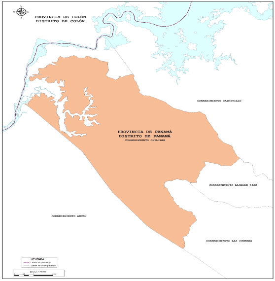 Se observa en el Mapa 1, la localización del corregimiento de Chilibre, que pertenece al distrito de Panamá, provincia de Panamá. El corregimiento de Chilibre cuenta con los siguientes límites: Norte, con los corregimientos Ancón y Caimitillo; al Sur, con los corregimientos Ancón y Las Cumbres; al Este, con los corregimientos Alcalde Díaz y Caimitillo; y al Oeste, con el corregimiento Ancón. Se nota hacia el Norte el nuevo corregimiento de Caimitillo, segregado del corregimiento de Chilibre. La base Legal de este corregimiento es la siguiente: Ley No. 29 de 10 de mayo de 2012 (Gaceta 27032-A).