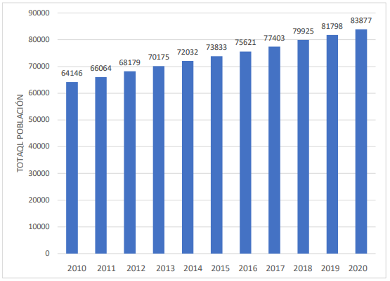 Se observa que la estimación y la proyección de la población para el 2020 es de 83, 877 habitantes, generando una huella hídrica de 5,542,887.63 m3 donde los sectores residenciales son los más significativos; es decir, una huella hídrica que cada año va en aumento. El crecimiento continuo de la población ocasiona un incremento de la demanda de agua, no solo por las actividades domésticas de consumo de agua, sino también, en el consumo de bienes y servicios. Castillo- Rodríguez, “et al.”, (2018, p.20) confirman al respecto que “el agua está involucrada directamente en todas las actividades realizadas en una ciudad”; por ende, en el contexto de presión demográfica. Díaz (2020ª, p.67) señala que “es evidente el uso de agua en las actividades cotidianas y en ocasiones se ignora que el agua ha participado en los procesos de producción.