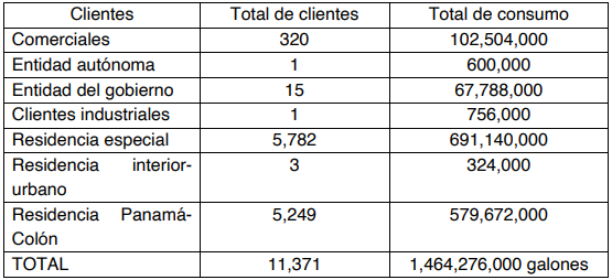 El análisis del total de clientes y total de consumo de agua en el Cuadro I se observa que el sector residencial ocupa el primer lugar con 11, 034 clientes y un consumo de 749,139,600 galones de agua anual. Al examinar notamos que a pesar de que los clientes residenciales interior-urbano son tres (3), tienen un alto consumo de agua.