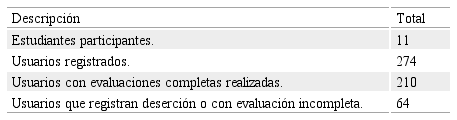 En cuanto a la participación de estudiantes y usuarios durante el período académico septiembre 2018-febrero 2019, se registró un total de 274 usuarios, de los cuales 64 desertaron o presentan evaluaciones incompletas. Por lo que, se promedia que cada estudiante evaluó de manera completa a 19 niños, niñas y/o adolescentes (ver datos en la tabla 1).