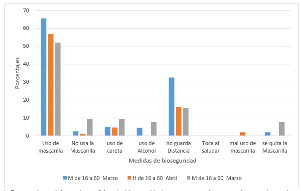 Al evaluar el uso de las medidas ante el COVID-19 por la población en los meses de marzo, abril y mayo, se graficó en base a sexos para su cómoda interpretación. En la figura 1 se muestra la incidencia en el uso de las medidas de bioseguridad por la población femenina del grupo etario de 16 a 60 años de edad.