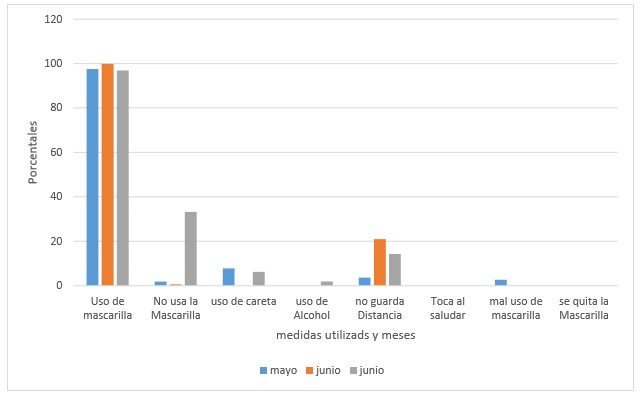 Las variables (uso de mascarilla, no, uso de mascarilla, uso de careta, uso de alcohol, no guarda la distancia de 2 metros, toca al saludar, se quita la mascarilla en público) se contaron mediante una observación directa y a distancia, se usaron monitoreos dos veces al mes por cuatro meses durante una hora en cada área designada para la investigación. Las horas serán de 8 a 12 pm en la que se termina con la última área de observación.