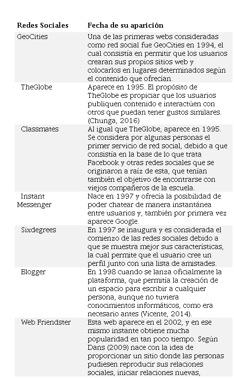 En la Tabla 1 se observa la evolución histórica de las principales redes sociales que han incursionado en la sociedad.