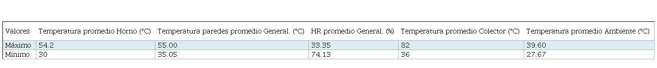 En la Tabla 4, la correlación entre la temperatura del colector y la temperatura interna del horno están considerablemente relacionadas (0.72) porque el sistema trasladó forzadamente el aire caliente de la superficie del colector al interior del horno. La correlación respecto a la humedad interna del horno mostró ser muy alta negativamente (-0.76) debido a la dependencia inversamente proporcional entre la temperatura y la HR, además el aire caliente húmedo fue evacuado por los extractores.