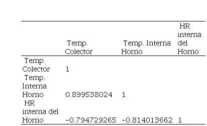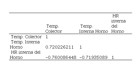 La relación de dependencia entre las variables se muestra en la Tabla 2. La temperatura del colector incide directamente sobre la temperatura interna del horno siendo el valor aproximado de 0.89. La HR en el interior del horno está indirectamente ligadas a la temperatura del colector y la temperatura del horno debido a que la correlación es alta pero negativa con valores de -0.79 y -0.81, respectivamente.