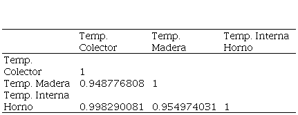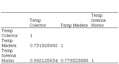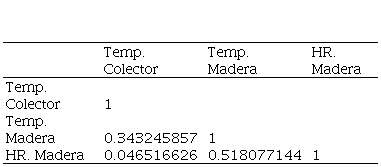 Las correlaciones entre la temperatura del colector y de la madera mostradas en la tabla 5 fueron bajas (0.34). Esto se debió al ingreso de aire a temperatura ambiente mediante los ventiladores con la finalidad de mantener en rangos pequeños la variación de temperatura en el horno.