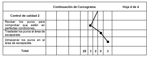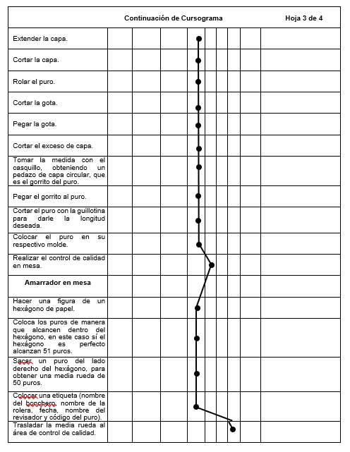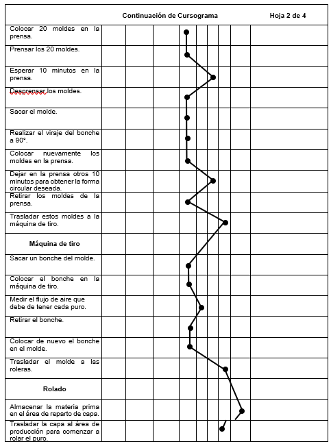 Además, se registró detalladamente el proceso de elaboración del puro mediante el uso de un diagrama de operaciones de proceso y un cursograma analítico. Esto tuvo como finalidad encontrar nuevas alternativas de mejora para aumentar la productividad y eliminar los procesos que no agregan valor a la calidad del puro, estas alternativas fueron la implementación de una silla ergonómica y la eliminación de una inspección innecesaria en el proceso del rolado, ambas importantes para el desarrollo y aumento de la productividad.