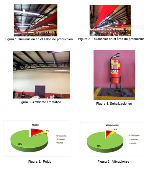 Los riegos latentes en cada puesto de trabajo que afectan significativamente el desempeño laboral son las posturas estáticas, posturas forzadas y movimientos repetitivos. Por consiguiente, se recomienda implementar medidas y acciones preventivas específicas para abordar estos riesgos. Sin embargo, se encontró que las condiciones y factores de trabajo son satisfactorios para los colaboradores en cuanto a iluminación, ventilación, ruido, vibraciones, señalizaciones, ambiente térmico y el ambiente cromático.