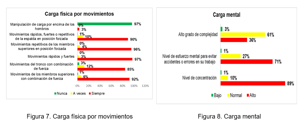 Por otra parte, se logró identificar peligros de origen ergonómico, tales como las posturas forzadas y carga mental, en menor medida la carga física por esfuerzo, como se muestra en las ilustraciones 5 y 6.