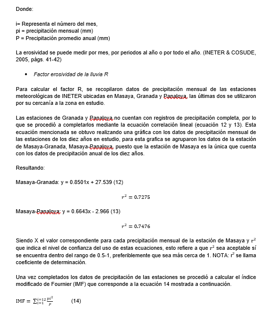 Los valores de R en MJ.mm. obtenido mediante el IMF fueron 7264.8, 7158.3, 4922.4 para la estación de Masaya, Granada y Panaloya respectivamente. Teniendo en cuenta los registros históricos de las tres estaciones se pueden clasificar como moderadamente lluvioso, ya que están en el rango entre 500 y 2000 mm. Existe una relación entre los valores de precipitación y el resultado del factor R, es decir, que sí las precipitaciones son altas R también lo será y sí las precipitaciones son bajas de igual manera lo será R. Como se puede apreciar los valores de R están coherentes a los datos de las precipitaciones anuales clasificándose para Masaya y Granada como moderadas, Panaloya al contar con el menor registro de precipitación su R es el menor de las tres estaciones, clasificándose como baja.
