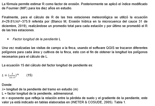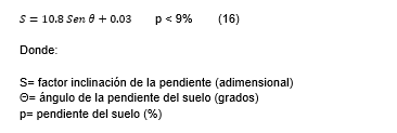En cambio, se utilizaron la siguiente ecuación 16, dependiendo del porcentaje de pendiente de cada polígono que corresponde al factor de inclinación de la pendiente.