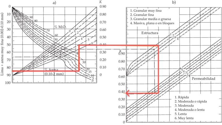 K = El factor susceptibilidad de erosión del suelo o erodabilidad del suelo, es la tasa de pérdida de suelos por unidad E*I para un suelo específico, medido en una parcela experimental o terreno estándar (22.13 m de largo, 9% pendiente, en barbecho y labranza continua).