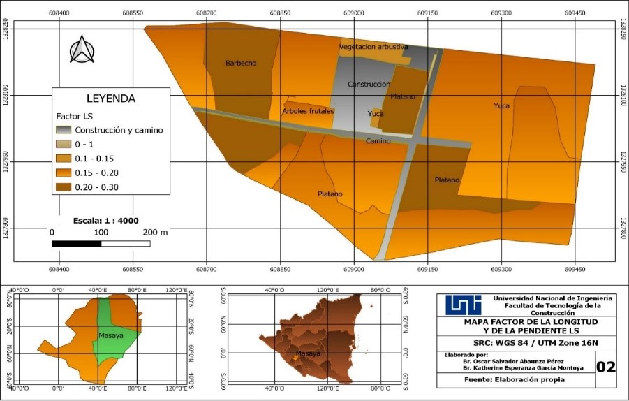 El área de estudio tiene pendientes que van entre el rango de 0.1 a 0.3 %, los cálculos de LS se determinaron con la fórmula establecida por (Wischmeier & Smith, 1976) y se tomó como referencia la pendiente menor a 9%. Aunque la pendiente resulto menor de 1%, dichas pérdidas están relacionadas a otros factores, como pendientes menores que influencian la velocidad de escurrimiento del agua de manera lenta, provocando en el tiempo desprendimiento de las partículas expuesta en la capa superficial. Así mismo sucede con el factor longitud (L), al existir distancias cortas la influencia en la escorrentía provoca lento movimiento de las partículas a través del flujo laminar que es insidioso en el tiempo, pasando muchas veces desapercibido, pero generando lavados. Los porcentajes de pendiente obtenidos en la FAE están clasificados como pendientes suaves, no aumentan la velocidad de flujo superficial y por ende no provoca un desprendimiento severo del suelo.
