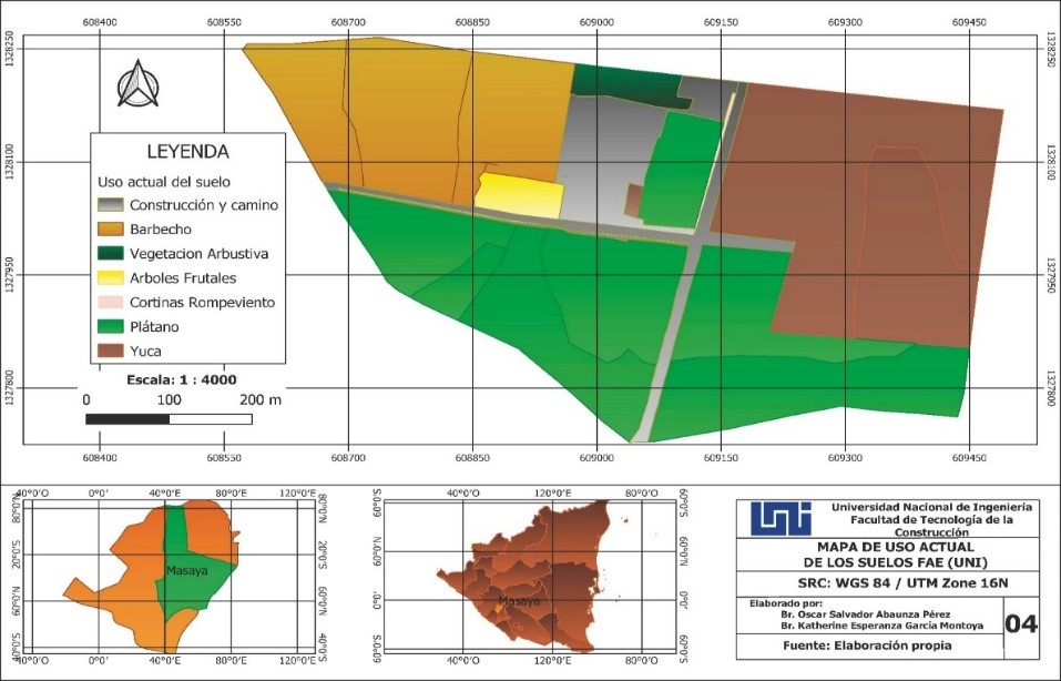 La Universidad Nacional de Ingeniería (UNI) actualmente cuenta con la Finca Agrícola Experimental la cual utilizará la abreviatura FAE-UNI para fines didácticos e investigaciones agrícolas, se han establecido cultivos como plátano, yuca, pipián y árboles frutales, entre otros, siendo producto de las prácticas que realizan los estudiantes de la carrera de ingeniería agrícola. Los suelos se caracterizan por tener textura franco arcillosa limosa y con un terreno de poca pendiente, sin embargo, existe erosión lo que causara graves daños a través del tiempo.