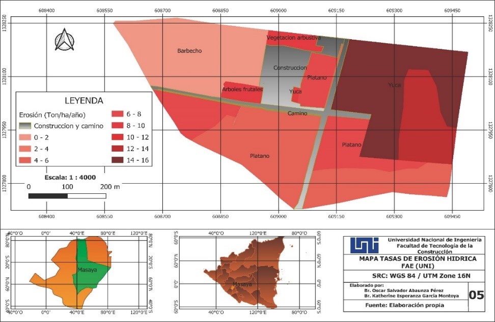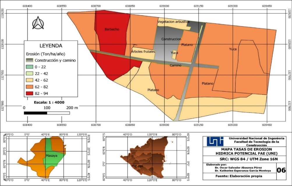 En el presente estudio se realizó la estimación de la erosión hídrica superficial en el uso actual y erosión potencial de los suelos de la Finca Agrícola Experimental de la UNI, ubicada en el Municipio “Las Flores”, Departamento de Masaya. Utilizando el método Ecuación Universal de Pérdida de Suelo propuesta por (Wischmeier & Smith, 1976) mediante las ecuaciones de estimaciones empíricas. Para aplicarse el método RUSLE (Ecuación modificada) se recopilaron datos existentes los cuales son, uso del suelo, tipo de suelo, permeabilidad, topografía de la zona de estudio en formato digital, imágenes satelitales, prácticas de cultivos, precipitaciones diarias, mensuales y anuales, intensidades máximas anuales, cartas pluviográficas y los respectivos análisis del suelo.
