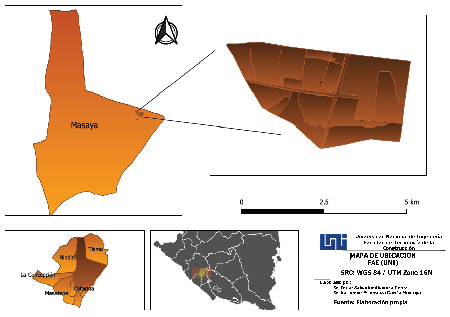 El estudio se realizó en la Finca Experimental Agrícola, ubicada en el departamento de Masaya, región Centro - Pacífico de Nicaragua, con 610.78 de superficie. El departamento de Masaya está ubicado en el kilómetro 31 de la carretera Masaya, del empalme Las Flores 8 kilómetros al este, sobre el camino de la calle principal que conecta la comarca La Bolsa con la rotonda Las Flores entre las coordenadas N12°00´5.33´´ W85°59´90.8´´, figura 2.