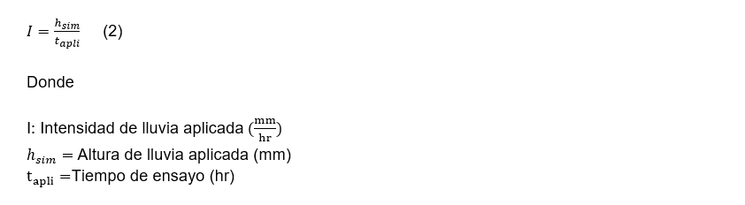 Una vez que se obtuvieron los datos del ensayo de la simulación de lluvia en las unidades requeridas se procedió al cálculo de la intensidad de lluvia aplicada y de la infiltración. A continuación, se presenta en la ecuación 2 la fórmula de la intensidad de lluvia.