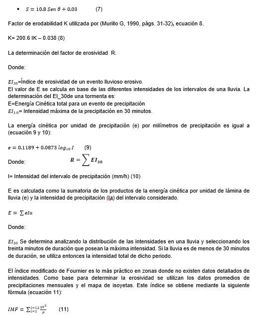 S = El factor de magnitud de la pendiente, es la proporción de pérdida de suelos de una superficie con una pendiente especifica con respecto a la pérdida de suelo en la pendiente estándar de 9%, con todos los otros factores idénticos. Este factor es adimensional.