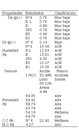 Para la determinación de estas propiedades se seleccionaron las diferentes áreas cultivadas actualmente. El suelo presenta una condición porosa alta, favorable para el crecimiento de las raíces, buena aireación y una infiltración alta del agua (función hidrología del suelo). Tomando en cuenta los tamaños de partículas de suelo en prueba de campo, se determinó una superficie áspera y al apretarlo entre los dedos es pegajoso, granuloso y mancha los dedos (para suelos franco arcillosos limosos). En la siguiente tabla 2 se encuentran los resultados de cada propiedad.