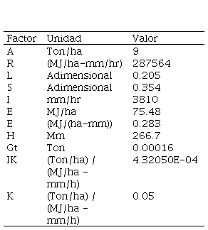 En el área de estudio, no se identificaron prácticas de conservación de suelo para la prevención o control de la erosión hídrica por lo que se le asignó a P el valor 1.