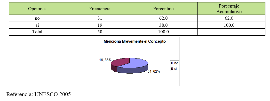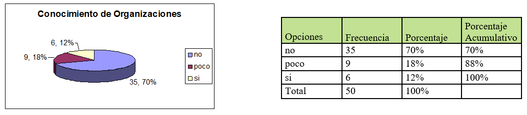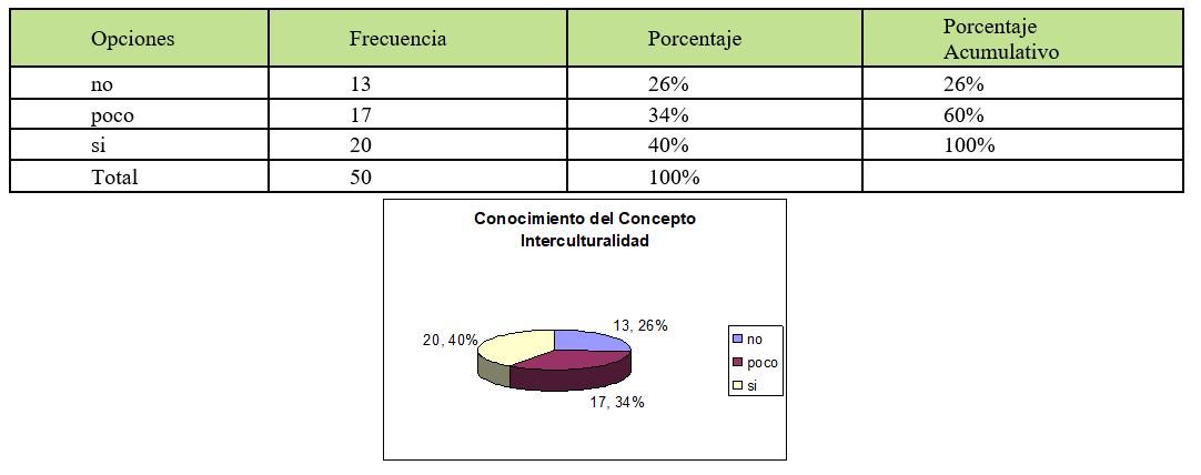 El resultado significativo que proporcionan los apartados es 38 % de los docentes tienen una idea de lo que es el enfoque intercultural y solo el 6% de los docentes conoce las organizaciones que conforman el Consorcio Intercultural.