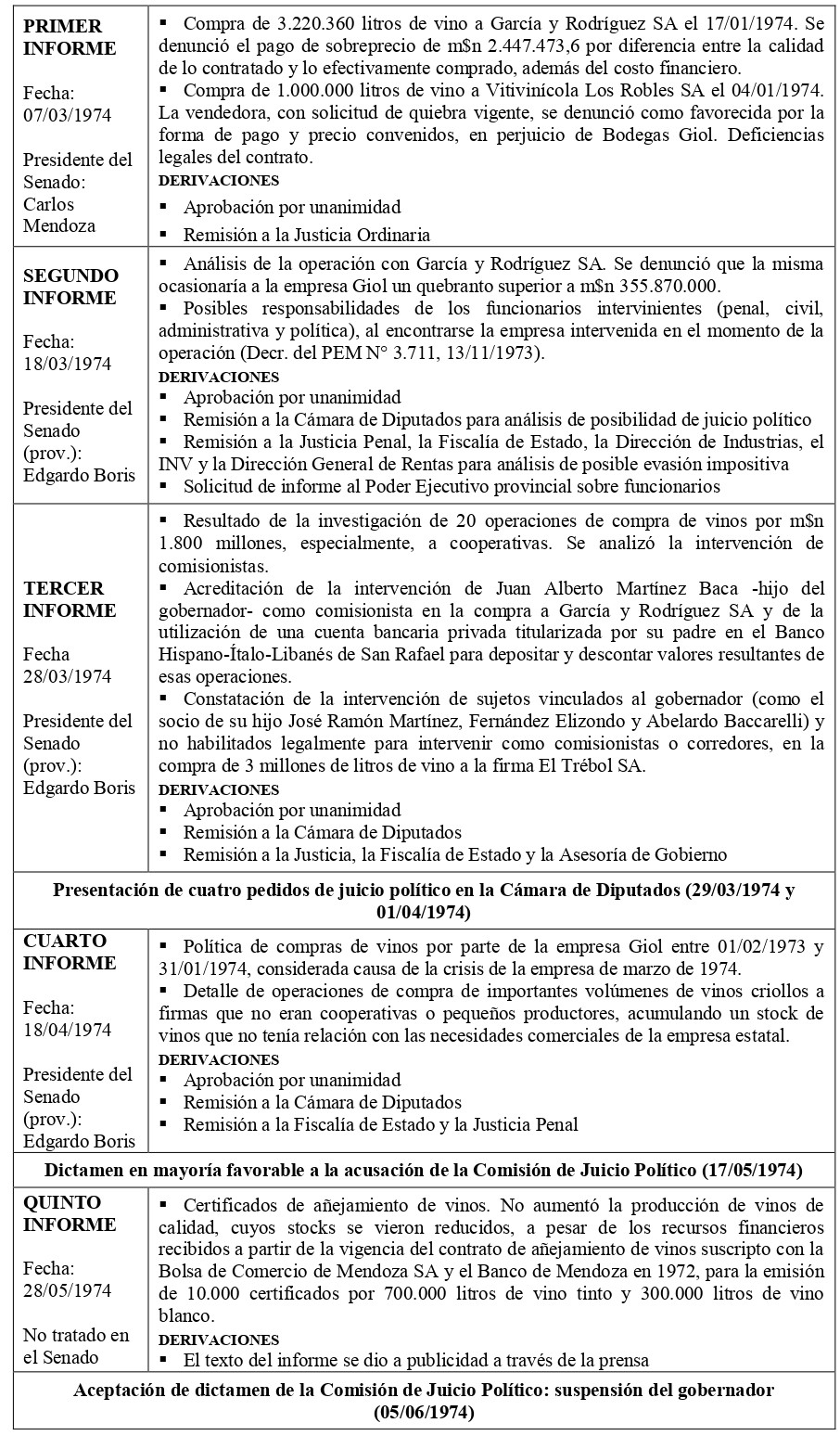 Un detalle de este proceso, que incluye una síntesis del contenido de los cinco informes que produjo la Comisión Investigadora -cuatro de los cuales fueron presentados en el Senado- y sus derivaciones políticas, jurídicas y administrativas, se expone en la siguiente tabla.