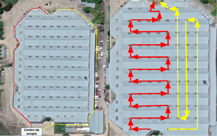 Se identificó que la recolección de residuos está a cargo de cuatro (4) personas, las cuales se encuentran distribuidas dos (2) al interior de la plaza y dos (2) en áreas externas, cada grupo realiza actividades asociadas a la limpieza, recolección y disposición de estos en el sitio de disposición final temporal como se muestra en la Figura 1. Por otro lado se encontró que las rutas de recolección se encuentran divididas en dos áreas macros la de verduras (recorrido color rojo) y la de cárnicos (trayecto color amarillo).