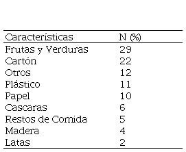 De acuerdo a la percepción de la muestra (Tabla 3), se determinó la composición de los residuos que se generan en los locales, encontrando que los residuos de frutas y verduras (29%) son los de mayor abundancia, seguido por el cartón (22%) y otros (vidrio, metal).