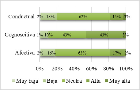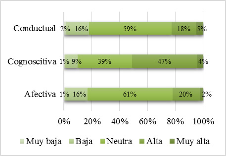 La dimensión cognoscitiva se presenta por el conocimiento consciente, pensamiento o creencias, que dentro de ciertos límites de certeza se tiene en cuenta si es malo o bueno con respecto hacia la investigación [24]. Los resultados muestran que los estudiantes del género femenino tienen una actitud neutral 47%; y los del género masculino muestran una alta actitud cognoscitiva con un 47%. Sin embargo, cuando se analiza la distribución general por dimensiones se obtuvo un resultado que fue alta y neutra con un 43% a partir de estos resultados se dice que el nivel que tienen los estudiantes hacia la investigación está entre neutra y alta.
