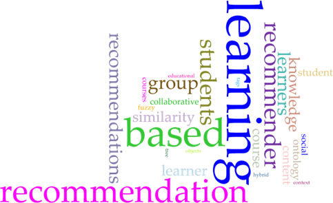 Conforme apresentado na Seção 3.2, uma das estratégias de extração de dados utilizadas neste estudo foi a mineração de texto dos 21 artigos aprovados. A partir da análise realizada, foram encontradas 227.054 palavras, incluindo as suas repetições. Dentre elas, as 25 palavras-chave, isto é, aquelas com maior quantidade de ocorrência no corpus, e suas respectivas frequências são learning (n=2217), based (n=1318), recommendation (n=1010), students (n=659), recommender (n=645), recommendations (n=512), group (n=525), learners (n=523), similarity (n=444), learner (n=438), knowledge (n=414), course (n=392), content (n=359), student (n=328), ontology (n=324), collaborative (n=295), social (n=294), courses (n=266), fuzzy (n=258),tags (n=228),objects (n=227), educational (n=222), hybrid (n=218), tree (n=195) e context (n=161). A Figura 2 apresenta a nuvem de palavras produzida a partir desses termos.