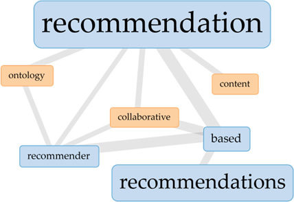 Com menor frequência estão os SRE baseadas em grafos (EA9 e EA16) e na identificação e uso do contexto dos usuários (EA18). Eles representam 15% dos estudos. As demais técnicas possuem ocorrência única para o seu respectivo estudo e correspondem aquelas baseadas em lógica fuzzy (EA1), algoritmo de grupalização (EA6), técnicas de agregação de votos e de meta aprendizado (EA8), métodos heurísticos (EA11) e em algoritmos de classificação juntamente com redes neurais (EA17). Tais resultados se confirmam por meio da análise de mineração textual referente às palavras-chave based (n=1318), recommendation (n=1010), recommender (n=645) e recommendations (n=512) e suas conexões. No gráfico apresentado na Figura 3, observam-se as seguintes co-ocorrências para os 4 termos: collaborative-based content-recommendation, collaborative-recommendation, collaborative-recommender, ontology-recommender e ontology-recommendation. Além disso, quando os termos têm seu papel invertido, isto é, os termos co-ocorrentes content (n=359), ontology (n=324) e collaborative (n=295) são definidos como palavras-chave, outras conexões relevantes são apresentadas: collaborative-filtering, content-based e ontology-based. Essas conexões evidenciam a proximidade entre os referidos termos e indicam que os SRE baseados em FC e em FBC estão entre os principais no corpus textual dos 20 artigos. A alta frequência das co-ocorrências se deve ao fato de que mais de 50% dos estudos contam com pelo menos uma delas, seja de forma isolada, seja de forma combinada em recomendadores híbridos. Por outro lado, o vocábulo ontology apresenta-se como termo co-ocorrente de forma significativa, pois está presente em 42.85% dos recomendadores híbridos propostos (EA2, EA3 e EA10).