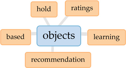 Ao comparar a análise realizada sobre os itens recomendados dos 20 artigos com os dados extraídos da mineração dos textos, percebe-se que a partir da palavra-chave objects (n=227) e course (n=392) obtém-se a indicação dos principais tipos de recursos recomendados. O termo objects possui as conexões learning-objects e objects-recommendation entre as mais relevantes em todo o corpus (Figura 4). De forma semelhante, o termo course possui a conexão course-recommendation (Figura 5). Tais co-ocorrências evidenciam a existência de recomendações de objetos de aprendizagem e de cursos nos artigos analisados. O fato de as palavras-chave estarem entre as 25 mais recorrentes expressam a predominância da recomendação desses itens em relação a outros. Já o item Páginas Web, não aparece nas ocorrências, pois os autores utilizam termos diferentes para se referir ao mesmo tipo de recurso, como web pages e links.