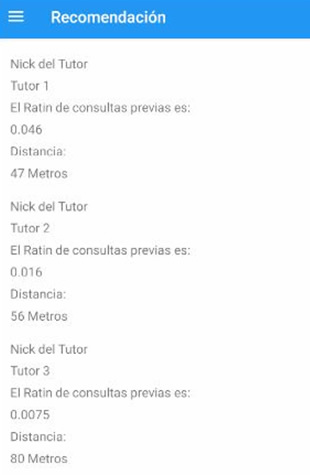 Finalmente, el Agente Estudiante de Juan informa la recomendación con las correspondientes distancias aproximadas de los tutores y el rating de servicio, cómo se puede ver en la Figura 8.