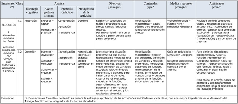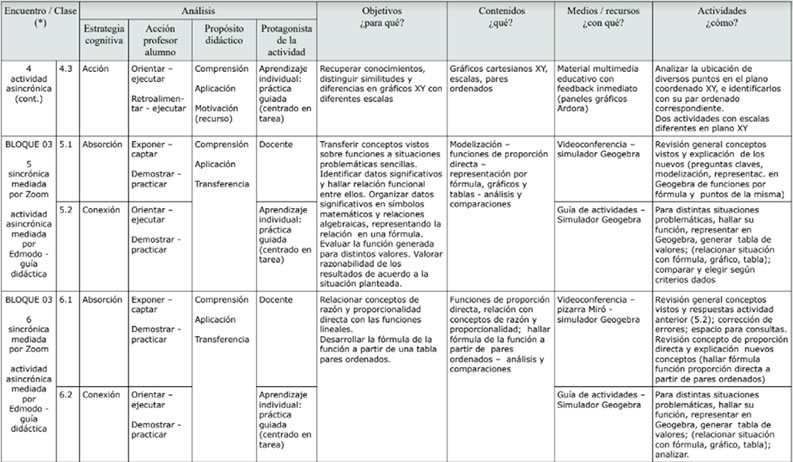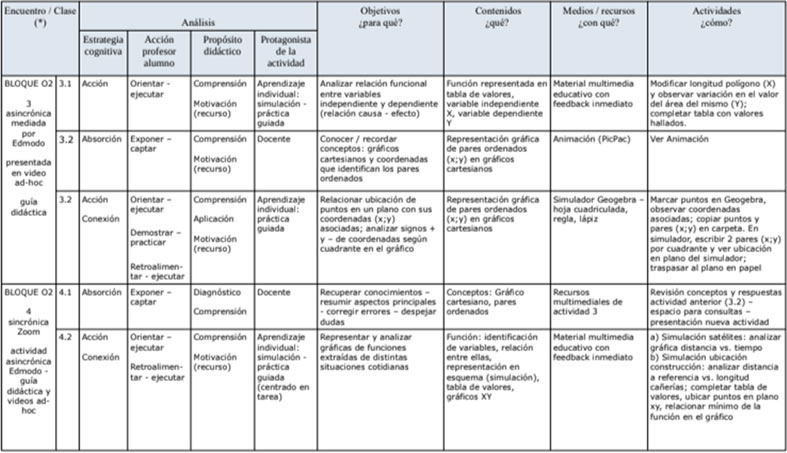En este nuevo contexto entonces, la secuencia didáctica propuesta pudo aplicarse parcialmente. Se seleccionaron presentaciones y enlaces a sitios interactivos en la explicación de los contenidos y ejercitación en la clase, y el material se subió al aula virtual para acceso permanente de los alumnos. Se mantuvieron las actividades propuestas de trabajo simultáneo en diversos marcos de conocimiento (numérico, gráfico, algebraico, geométrico) y con la aplicación de Geogebra, finalizando con el trabajo integrador de modelización matemática. No pudo llevarse a cabo la propuesta del foro.