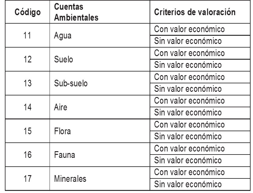 Conforme a los activos ambientales identificados se puede presentar la siguiente tabla de cuentas de activos: