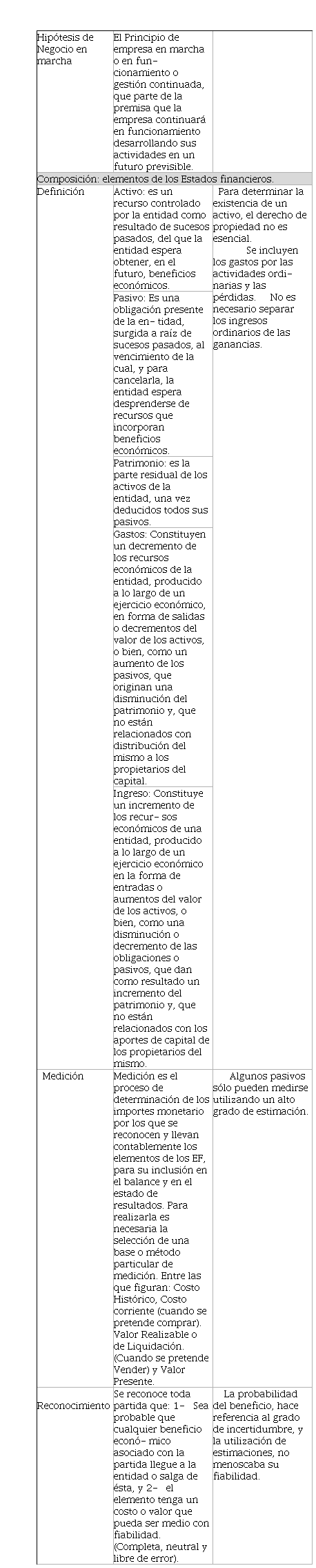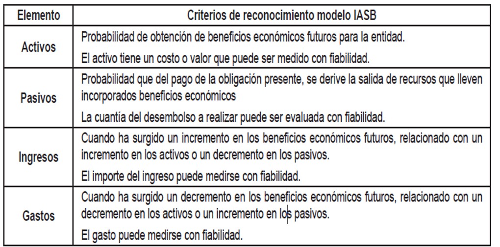 Se había planteado, anteriormente, que son elementos de los estados financieros los activos, los pasivos, los ingresos y los gastos. Cada uno de estos elementos, corresponden a la representación de los hechos de la realidad y, por tanto, es necesario tener en cuenta los criterios dispuestos en el marco conceptual para su reconocimiento (ver tabla 2).