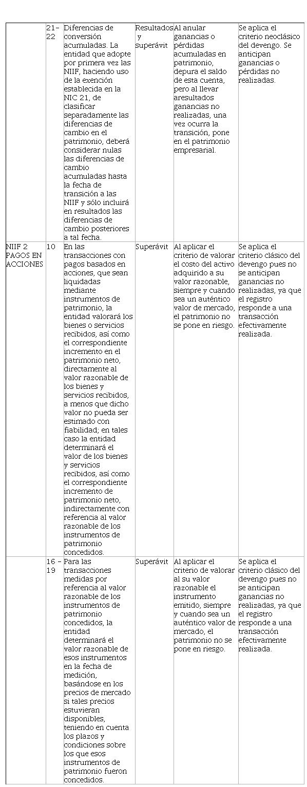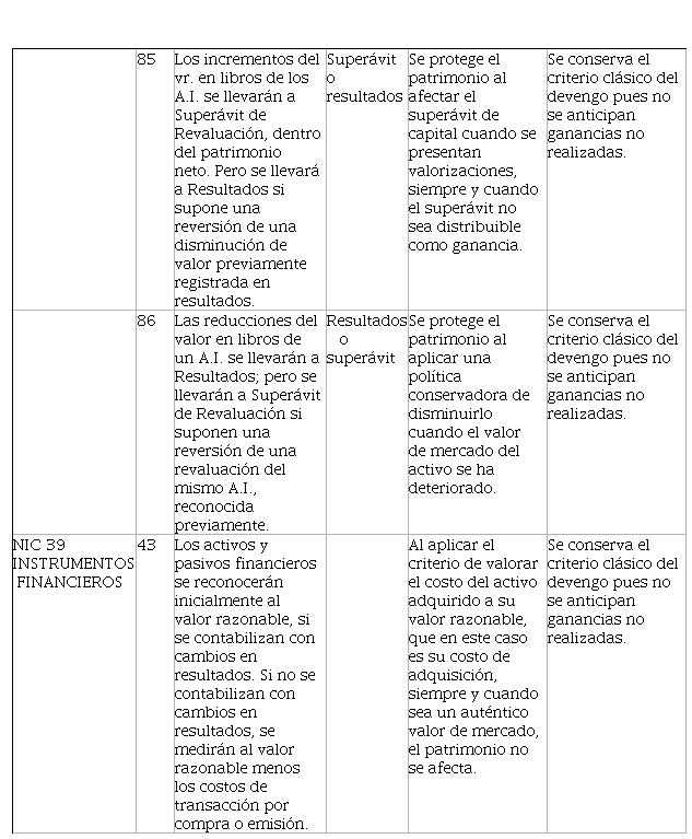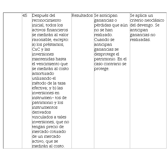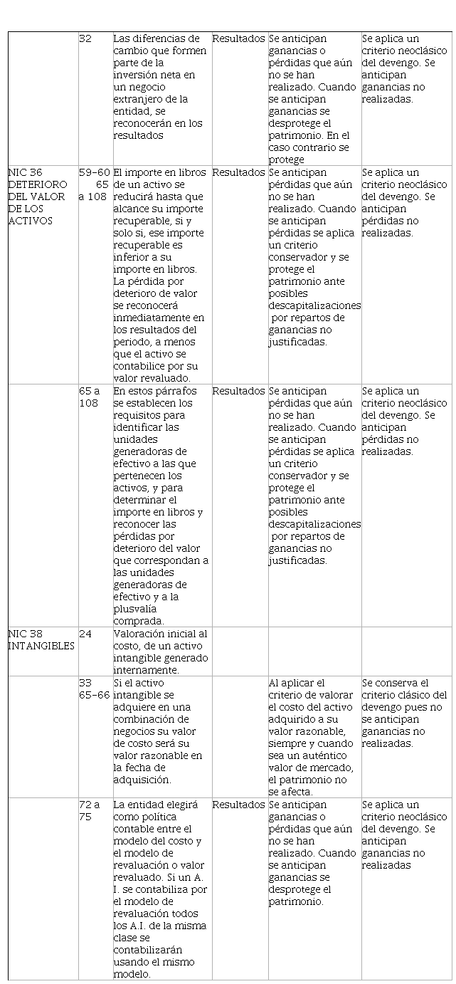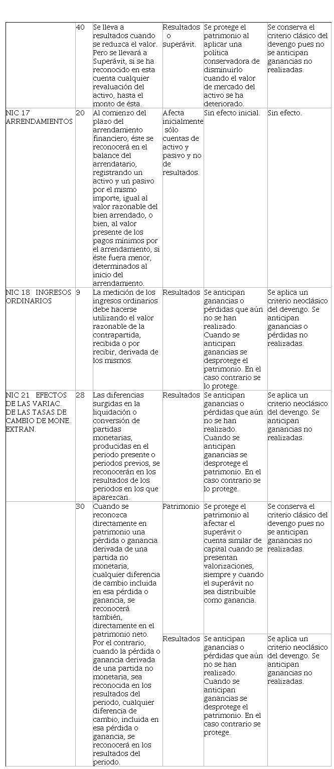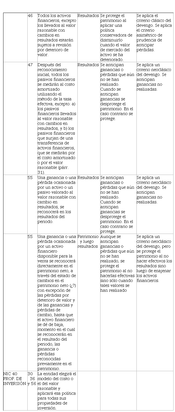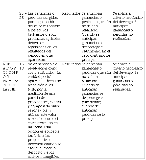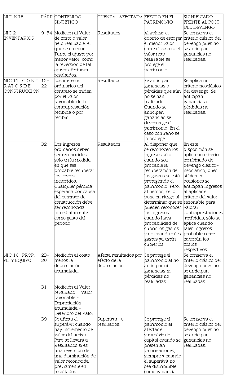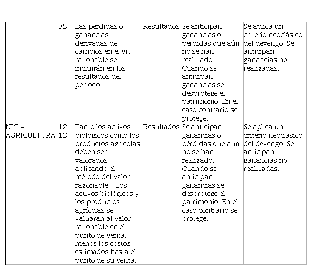 En el Cuadro 1 se presenta un análisis al utilizar algunos de los están- dares relativos a los activos, pasivos, ingresos y gastos, en el modelo NIC-NIIF y sus efectos por la aplicación del criterio del devengo (base de acumulación). Aquí hay que advertir que el modelo NIC-NIIF usa dos criterios de devengo, uno basado en la teoría clásica del valor y otro basado en la teoría económica neoclásica del valor. Denominaremos a continuación como “criterio clásico del devengo” al criterio tradicional de devengo coherente con la teoría clásica del valor. Denominaremos como “criterio neoclásico del devengo” al nuevo criterio de devengo coherente con la teoría neoclásica del valor. El criterio clásico se aplica cuando se reconoce el ingreso, costo o gasto, a partir de los hechos o transacciones realizados aplicando una base valorativa como la del costo histórico, como es el caso de los inventarios en el modelo analizado (NIC 2). El criterio neoclásico se aplica cuando se establece la base de valoración de los hechos a partir del criterio del valor razonable o de sus sustitutos (valor revaluado, valor neto realizable o valor en uso), es decir, cuando se recurre a los mecanismos subjetivos de valoración, desde la teoría de la demanda, sin requerir de la realización de una transacción económica formal, como es el caso de los productos agrícolas (NIC 41) o de buena parte de los instrumentos financieros. En este último caso, reiteramos, no se requiere de la realización de una transacción de intercambio para dar por realizado un ingreso, costo o gasto, sino que es suficiente la valoración, al valor razonable del activo o del pasivo, de acuerdo con las diversas metodologías o procedimientos valorativos aceptados dentro de la normativa NIC-NIIF. (Ver cuadro Nº 1 en la pág. siguiente)