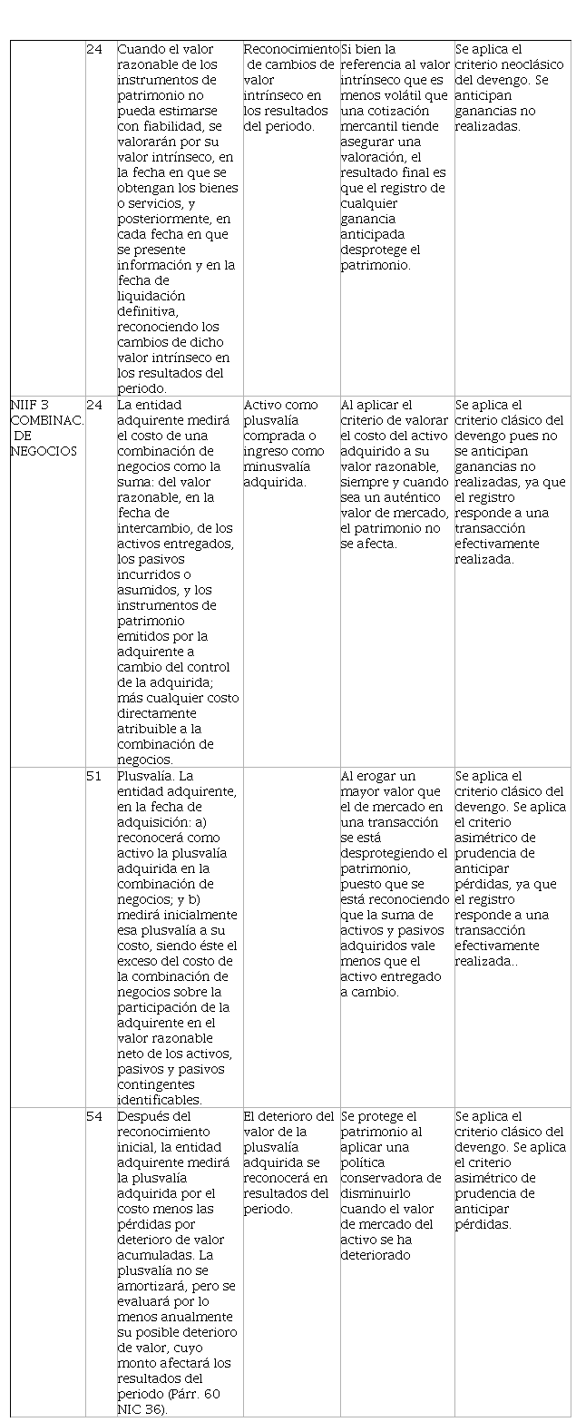 En el cuadro 1 se puede constatar la presencia de las dos orientaciones del devengo como resultado de la aplicación de la dicotomía valorativa: valor de costo histórico realizado y valor de mercado probable. Lo que llama la atención de tal presencia es la carencia de justificación lógica para el mantenimiento de la base valorativa del costo si lo que interesa al objetivo del modelo es la información actualizada, no importa si ella está fundada en una base probabilística, la del valor razonable.