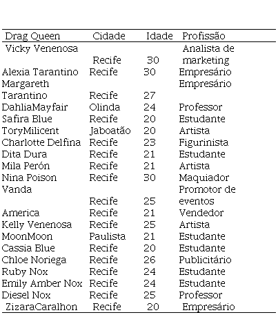 Nesse contexto surge o estudo proposto, com o intuito de investigar o comportamento de consumo de moda de Drag Queens da cidade do Recife. Foram realizadas entrevistas em profundidade com 20 sujeitos de idades entre 18 e 35 anos que performam a arte drag em Recife e Região Metropolitana, cujo perfil está apresentado no Quadro 2. A identificação e abordagem de alguns dos entrevistados foi realizada por meio de seus perfis nas redes sociais (Facebook e Instagram). Além disso, para alcançar alguns dos sujeitos, foi aplicada a técnica da Bola de Neve, onde o indivíduo entrevistado indica outro indivíduo que também faz parte do recorte definido.