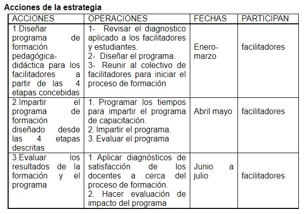 Keywords: Pedagogical-didactic training process, Integral training, Methodological strategy, Teaching performance, Facilitators.